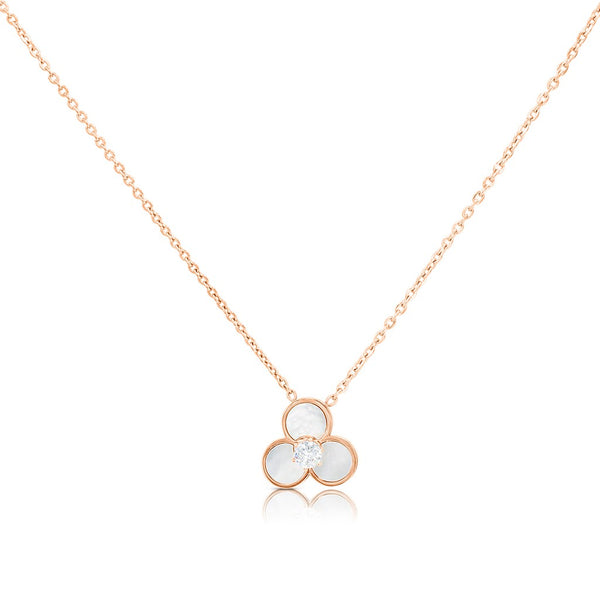 SO SEOUL Alette Three-Leaf Clover Necklace with Mother of Pearl, Diamond Simulant Zircon, and Rose Gold Chain