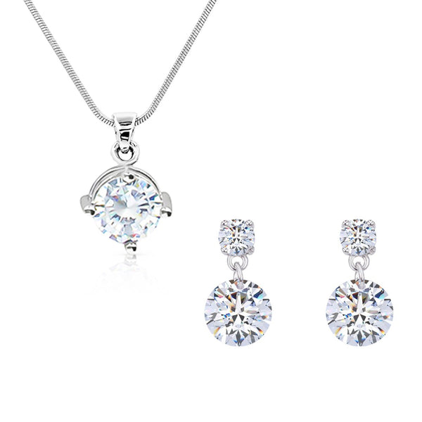 Experience luxury and timeless beauty with the SO SEOUL Athena Jewelry Set. A dazzling duo crafted to perfection, this set boasts a 2.0 CARAT round brilliant-cut diamond simulant zirconia pendant and matching drop earrings. The solitaire pendant, with its radiant shimmer, is a testament to classic elegance, while the complementary earrings, suspended from sparkling studs, dance with light with every turn of the head. Together, they create a harmonious ensemble, elevating your style quotient. The finely-crafted chain ensures the pendant sits gracefully, making a statement of refined taste. Whether you're gifting this set to a loved one or adorning it yourself for a special occasion, the Athena Jewelry Set is a celebration of sophistication and allure.