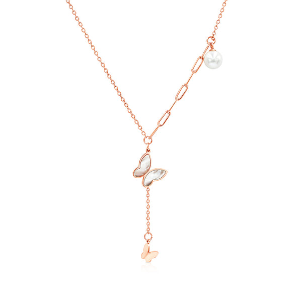 Embark on a journey of elegance with the SO SEOUL Caria Butterfly Whisper Mother of Pearl with Pearl Rose Gold Fixed Necklace, a celebration of delicate beauty and grace. This enchanting necklace features a masterfully crafted butterfly, its wings adorned with the finest mother of pearl, creating an ethereal play of light and iridescence. Beside the butterfly rests a luminous solitaire pearl, adding a touch of timeless sophistication and charm.