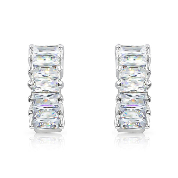Introducing the epitome of elegance - SO SEOUL's Emerald-Cut Diamond Simulant Cubic Zirconia Huggie Hoop Clip Earrings. Each piece is a showcase of refinement, featuring a sequence of emerald-cut cubic zirconia that glimmer with a clear, crisp brilliance akin to the finest diamonds.