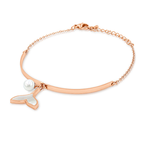 Dive into elegance with the SO SEOUL Ocean The Sea Whale Tail Charm with Dangling Pearl Rose Gold Bracelet. This exquisite bracelet captures the essence of the sea, featuring a delicate whale tail charm paired with a lustrous dangling pearl, all set against a backdrop of shimmering rose gold.